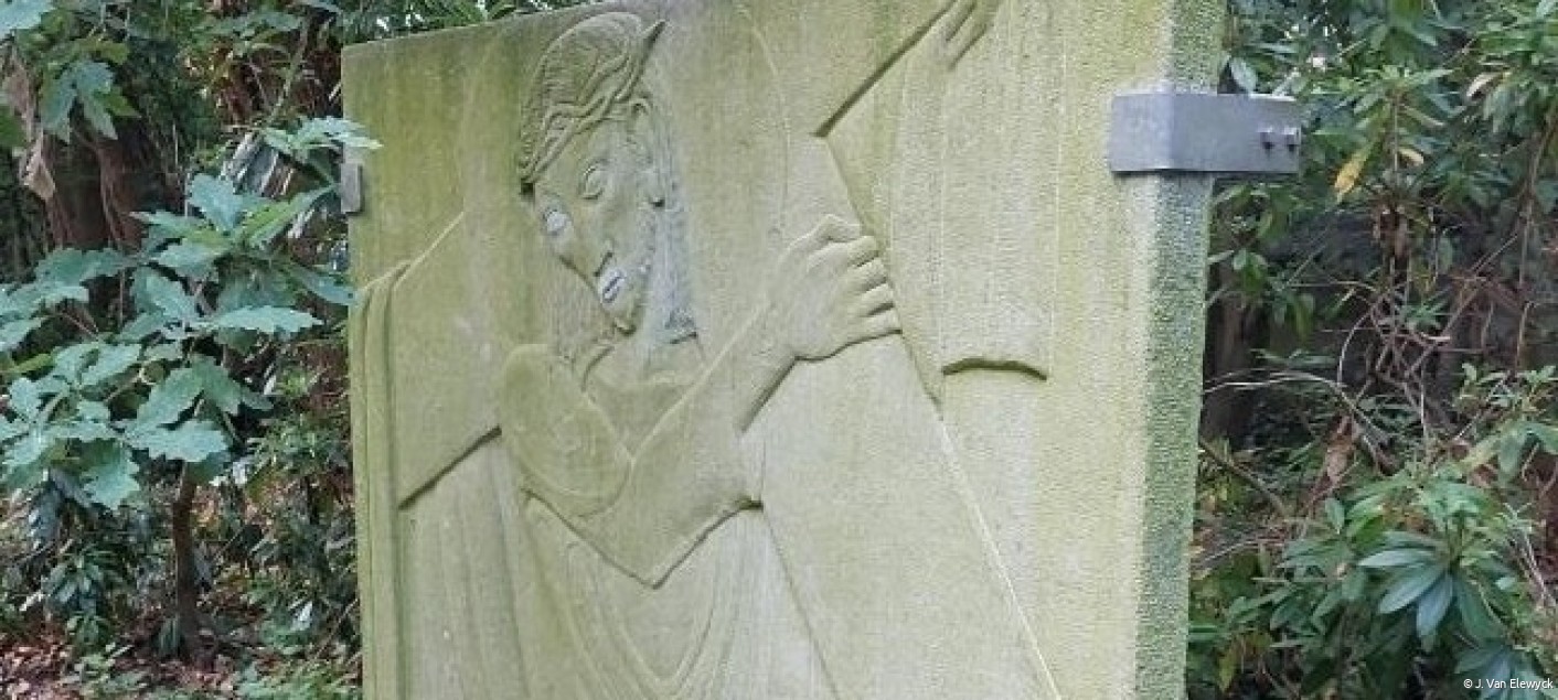 We bewonderen de openluchtkruisweg (1942-1944) met veertien monumentale in arduin gebeitelde bas-reliëfs in het Parkdomein Hof ter Zielbeek aan de Gasthuisdreef in Ruisbroek.